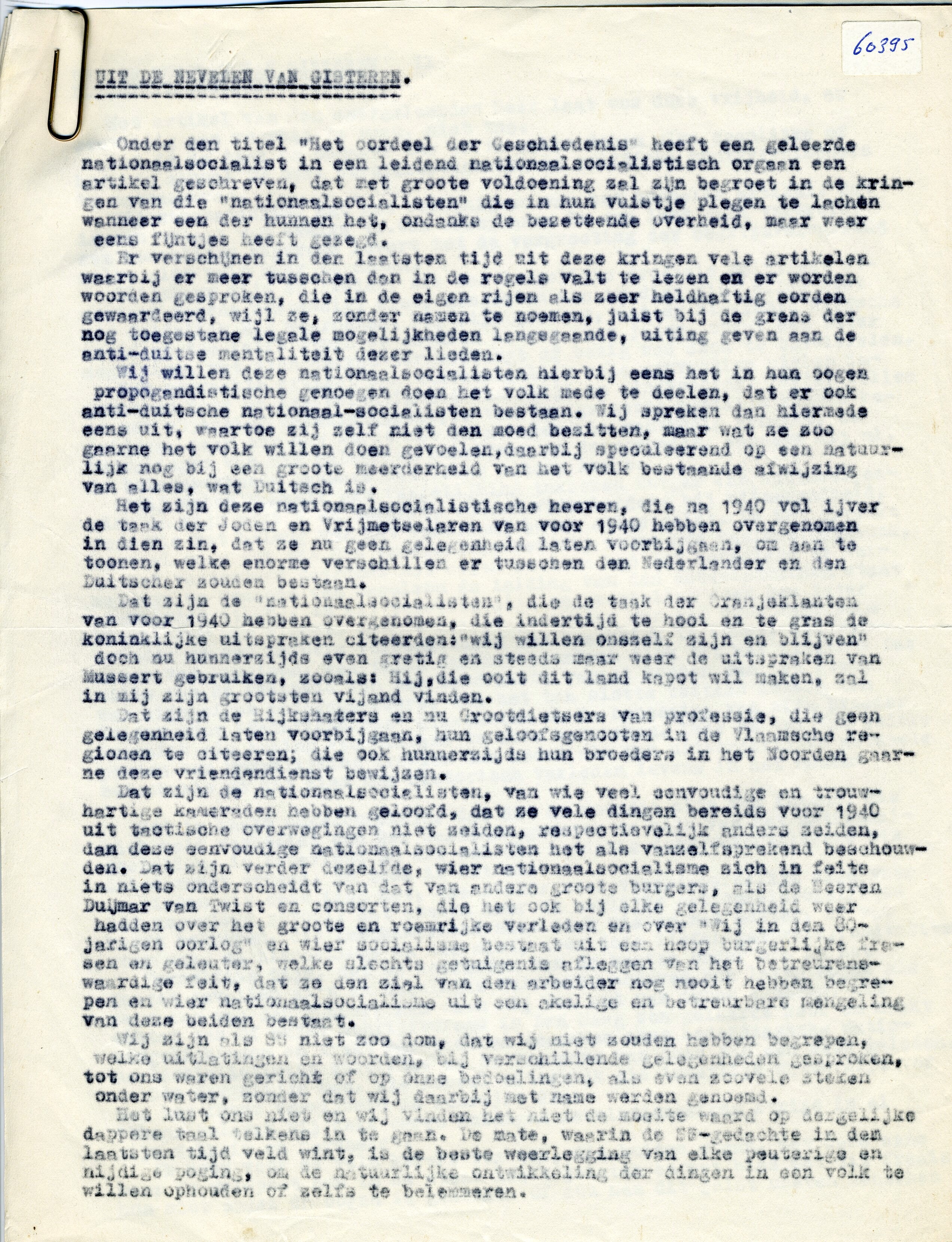 Drie losse bladen met een overdruk van een artikel van de hand van Feldmeyer uit "Storm-SS" van 14 mei 1943: "Uit de nevelen van gisteren".