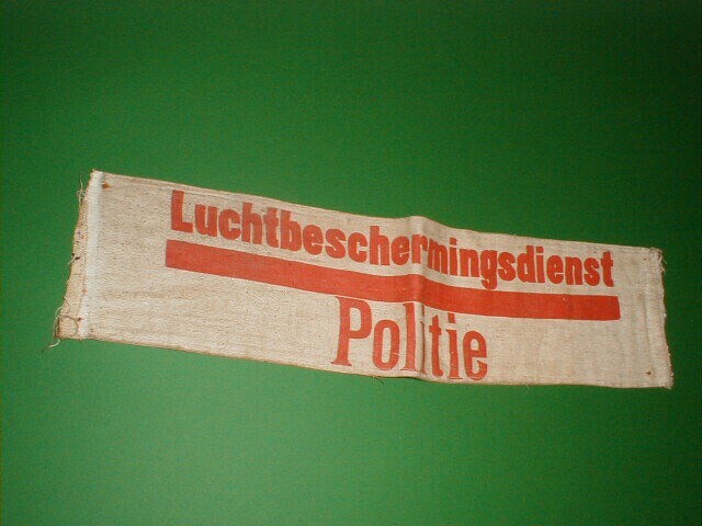 Een wit katoenen mouwband bestaande uit drie lagen. Op de mouwband staat in rode letters gedrukt: "Luchtbeschermingsdienst. Politie".