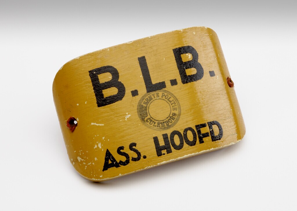 Een afgeronde geel geverfde houten badge om op de arm te dragen. Op de badge met zwarte letters: "B.L.B. Ass. Hoofd" en een rond stempel van de "Gemeentepolitie Culemborg". Het werd gedragen door de assistent van het Blokhoofd Luchtbescherming te Culemborg.
