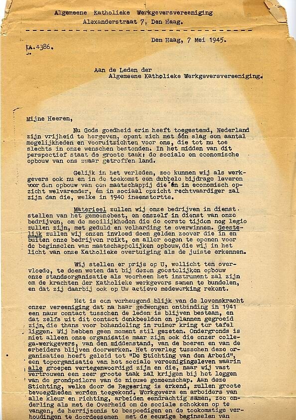 Circulaire over de bevrijding gericht aan de leden van de Algemeene Katholieke Werkgeversvereeniging.