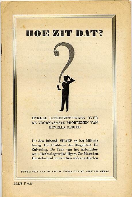 Twee boekjes met in elk daarvan 20 artikelen over de problemen van bevrijd gebied, waaronder: illegaliteit en zuivering. Op de voorzijde een afbeelding van een lezende man met een groot vraagteken. Het boekje omvat 67 pagina's.