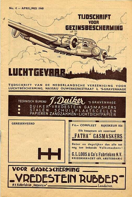 Twee tijdschriften van de Nederlandsche Vereeniging voor Luchtbescherming. Het betreft de nummers 4 en 5 (1940). De voorzijde toont bovenaan een bommenwerper; de rest van de voorpagina en de achterzijde is gevuld met advertenties.