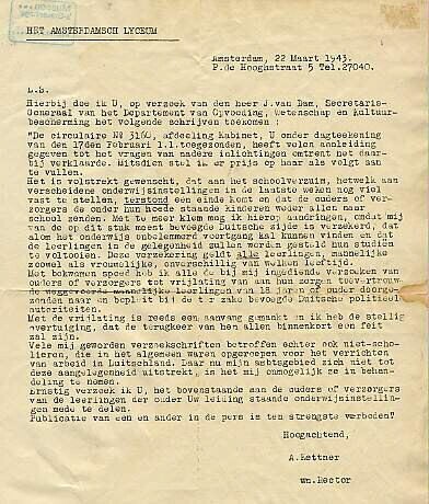 Een gestencilde brief van het Amsterdamsch Lyceum aangaande het aanhoudende schoolverzuim en de zorgen van ouders vanwege de voor arbeidsinzet weggevoerde mannelijke scholieren naar Duitsland. De circulaire is gedateerd 22 maart 1942 en ondertekend door de waarnemende rector, A. Kettner.