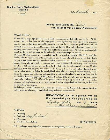 Een voorgedrukte met pen ingevulde brief waarin de leden van de afdeling Zeist van de Bond van Nederlandsche Onderwijzers worden uitgenodigd om de "Huishoudelijke Vergadering op, Vrijdag, 28 Nov. om 4 uur" bij te wonen in "Het Wapen van Zeist". In de vergadering zal de eenheid binnen de onderwijzersvakbeweging en andere kwesties aan de orde komen. De brief is gedateerd 22 november 1941.