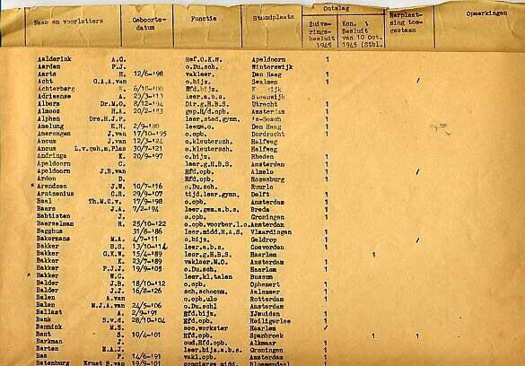 Lijst van onderwijzers met gegevens van het zuiveringsbesluit, herplaatsing etc. Is gevat in papieren kaft.