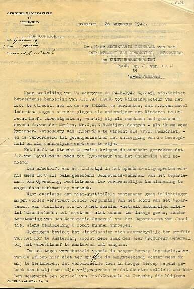 Brief aan de heer J.van Dam met afschrift van het vonnis over de van ontucht verdachte onderwijzer A.R. van Bavel.