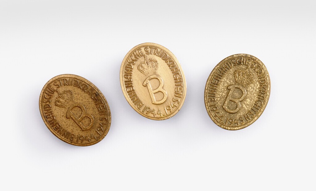 Drie exemplaren van de "Herinneringsinsigne Binnenlandse Strijdkrachten 1944-1945" in de vorm van ovale bronskleurige metalen insignes om in een knoopsgat te dragen. In het midden een bekroonde 'B' en langs de rand: "Binnenlandsche Strijdkrachten 1944-1945". Het insigne werd na de oorlog door Prins Bernhard ingesteld voor leden van de Binnenlandse Strijdkrachten (B.S.) die onder zijn bevel stonden.