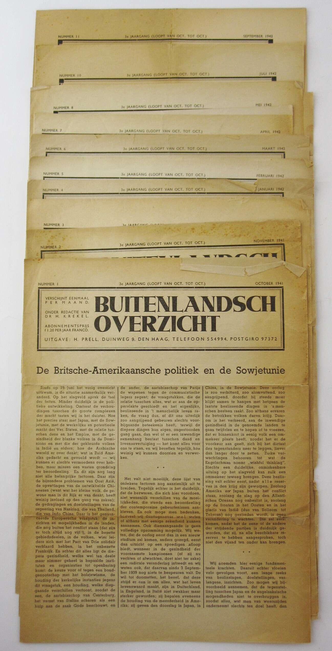 Tien exemplaren van het maandblad "Buitenlandsch Overzicht''. Jaargang drie loopt van oktober 1941 tot oktober 1942. De nummers 1 t/m 8 en de nummers 9 en 10 zijn aanwezig. Buitenlandsch Overzicht bevat beschouwingen over de buitenlandse wereldpolitiek vanuit nationaal-socialistisch standpunt.