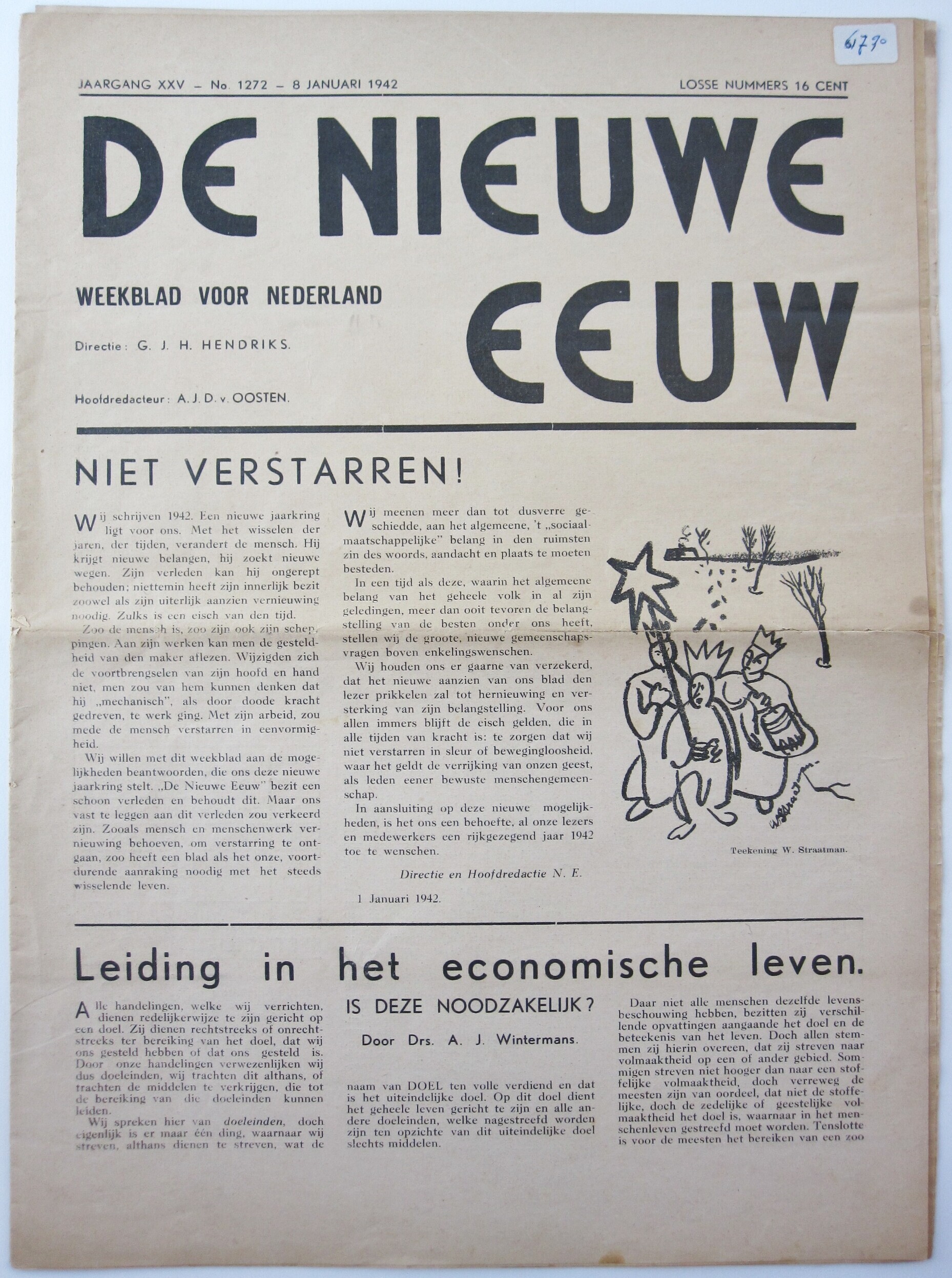 Exemplaar van: "De Nieuwe Eeuw. Weekblad voor Nederland". Het betreft jaargang 25, nummer 1272, 8 januari 1942. Deze editie telt 12 pagina's met artikelen over volkskunst en Nederlandse letterkunde.
