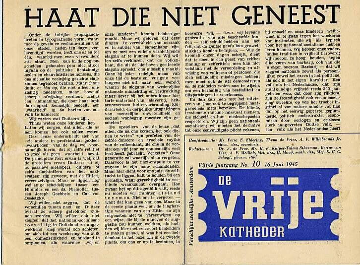 Drie uitgaven van het voormalig illegale blad "De Vrije Katheder" vijfde jaargang: het bevrijdingsnummer en de nummers 10 en 11 van 1945. Nummer 11 bevat een gedicht van C. J. Kelk en een beschouwing over Th. Mann door Teun de Vries.
