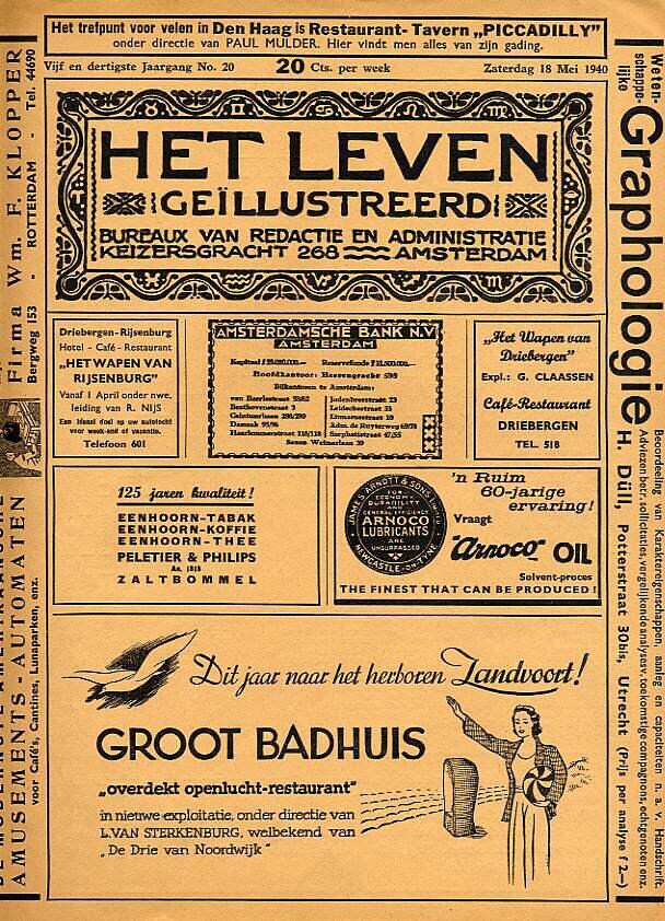 Twee exemplaren van het sensatieweekblad ''Het Leven Geïllustreerd'' dat verscheen in de periode 1906-1941. Het betreft de nummers 20 (18-5-1940) en 21 (25-5-1940). <br>De bladen kenmerkten zich door een gedurfde nieuwsgaring, opvallend los taalgebruik en actuele foto's. In 1941 kreeg het blad een verschijningsverbod. In deze edities aandacht voor de Duitse inval.