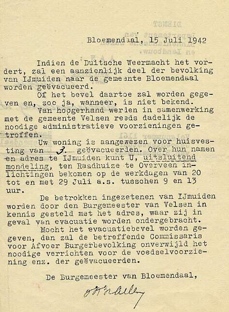 Bericht van de Dienst Departement van Binnenlandse Zaken en Landbouw over mogelijke huisvestiging van geëvacueerden uit IJmuiden in Bloemendaal.
