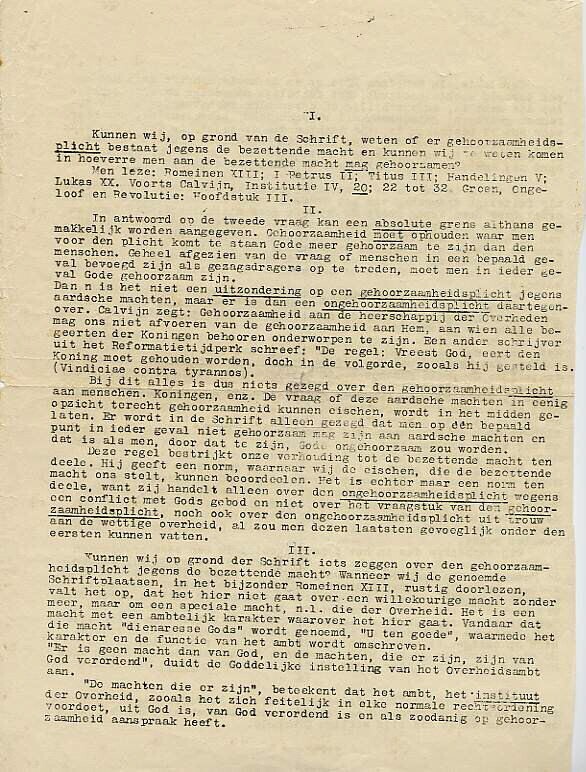 Gestencilde tekst waarin de anonieme auteur op grond van de bijbel tot de conclusie komt dat ongehoorzaamheid aan de Duitse bezetter geoorloofd is.