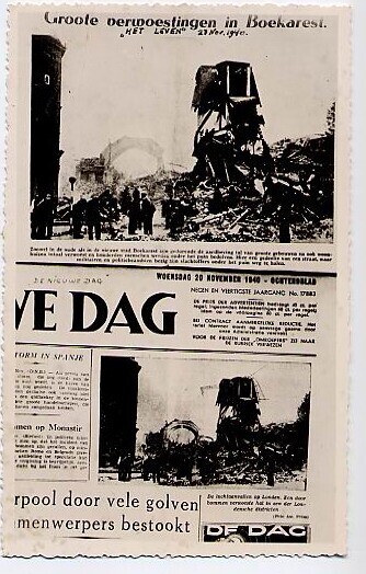 Ansichtkaart met een zwartwit foto van een gedeelte van de voorpagina van "Het Leven" van 28 november 1940'' met een foto van de verwoesting van Boekarest door een aardbeving en van Londen ten gevolge van luchtaanvallen.