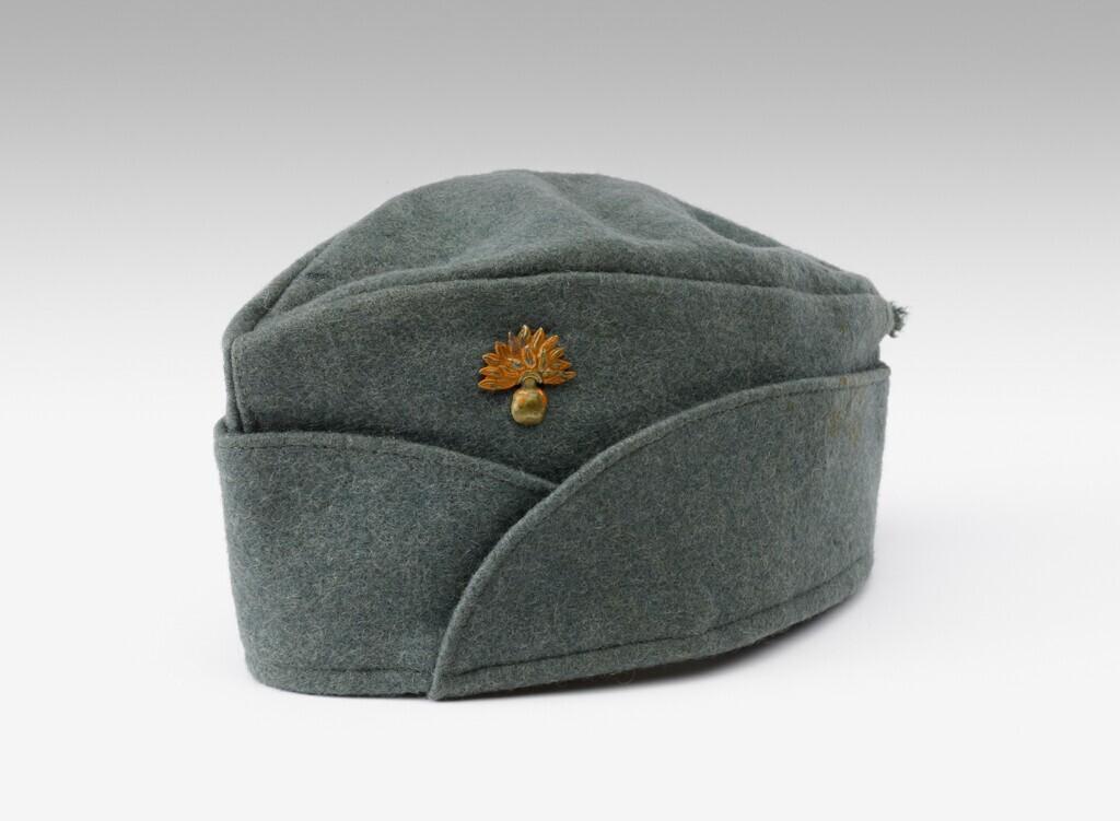 Grijsblauwe veldmuts met goudkleurig metalen insigne van de grenadiers. De binnenkant is gevoerd met wit en bruin katoen en voorzien van een hoofdband van zwart leer.