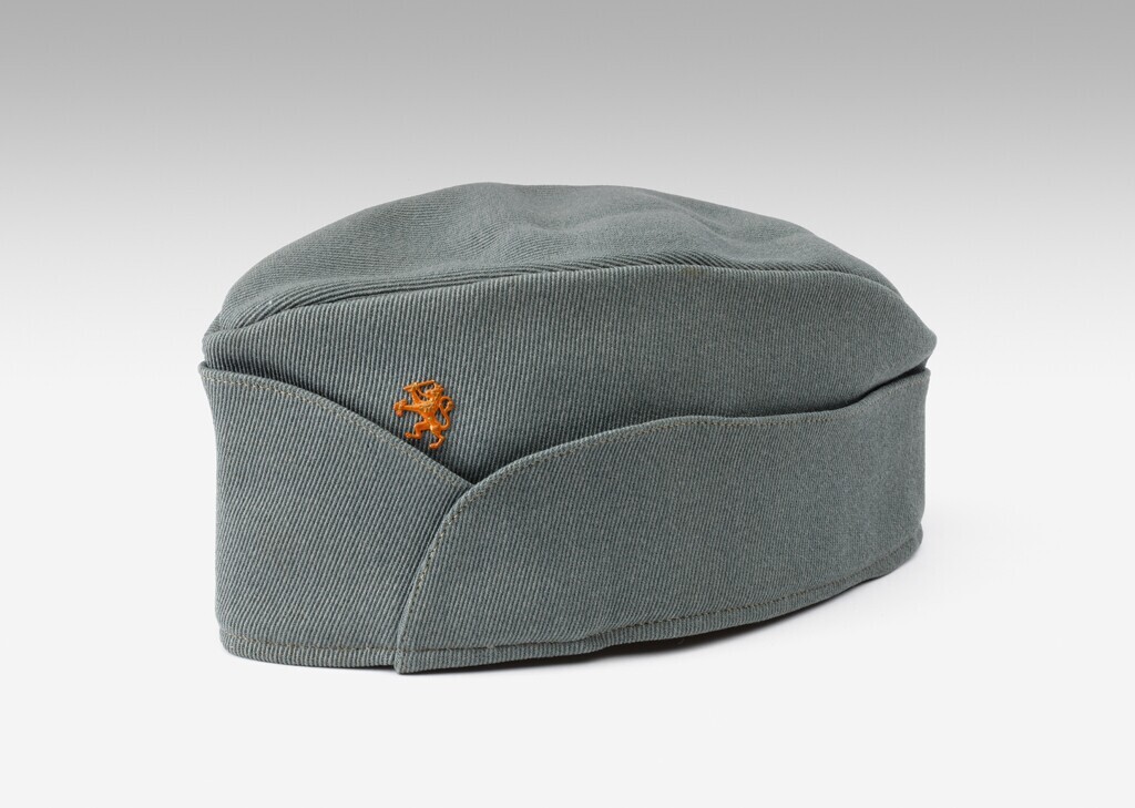 Blauwgrijze veldmuts met oranje insigne in de vorm van de klimmende Nederlandse leeuw. De binnenkant is gevoerd met bruine stof en voorzien van een leren hoofdband.