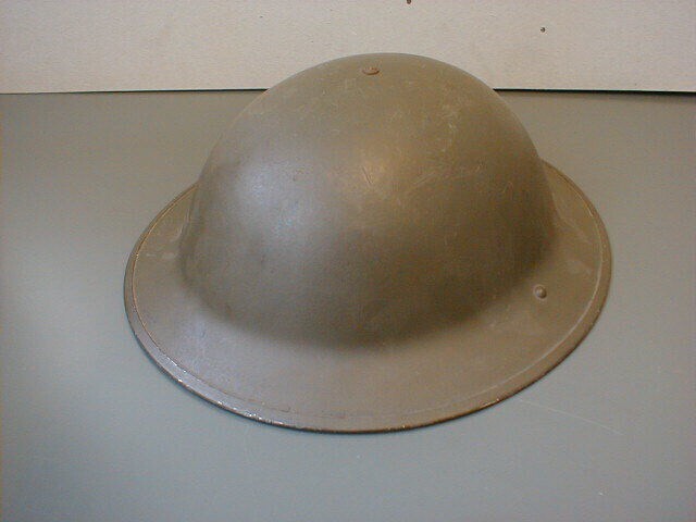 Groene Engelse helm na de oorlog door het Belgische leger gebruikt. Het binnenwerk is compleet met kinband. De hoofdband is van zwart imitatieleer.