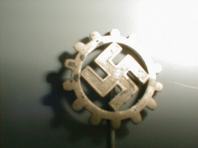 Een rond metalen reversspeldje van het Deutsche Arbeitsfront (DAF) met in het midden een opengewerkt hakenkruis en radvormige rand.