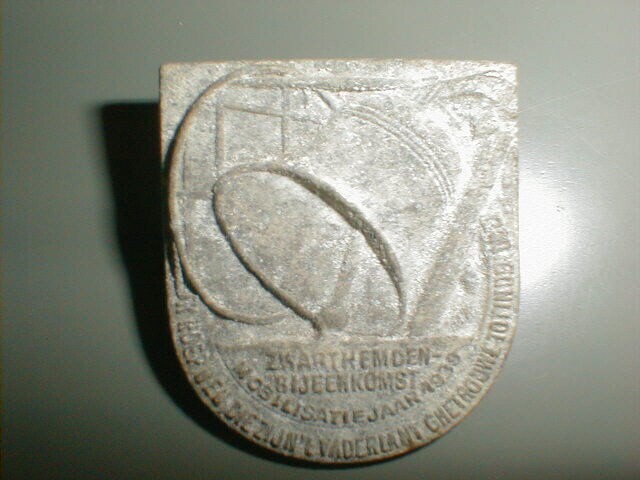 Een zinken speldje van de N.S.B. in de vorm van een schild. Op het insigne is een afbeelding van luidende bel. Onder de bel staat: " zwarthemden-bijeenkomst mobilisatiejaar 1939; Ik roep hen die zijn 't vaderlant ghetrouwe tot in den doet".