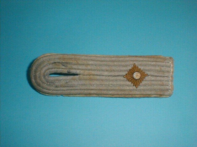 Een epaulet, schouderstuk van een 'Oberleutnant Infanterie' van zilverdraad op wit vilt met afgerond uiteinde. Op het epaulet een goudkleurige metalen ster.