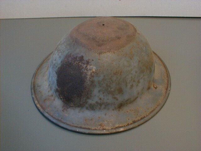 De Engelse helm zonder binnenwerk maar wel met een kinband. Op de voorkant nog sporen van een embleem.