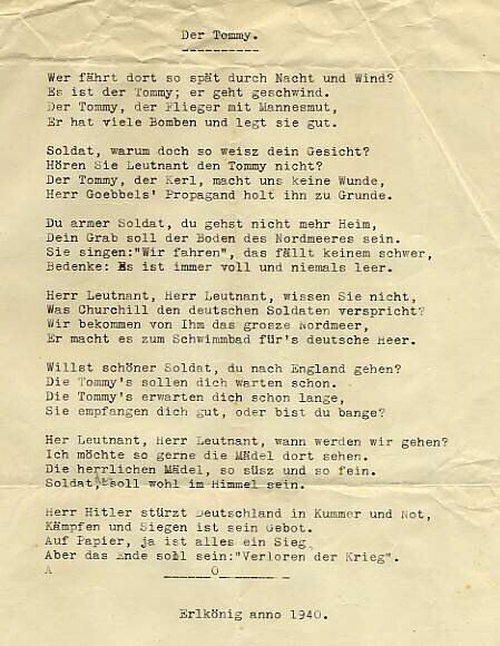 Duitstalig gedicht van zeven coupletten. Parafrase van 'Der Erlkönig'. Het gedicht is getypt op papier met een watermerk met de tekst: ‘Estevaer Bank'.