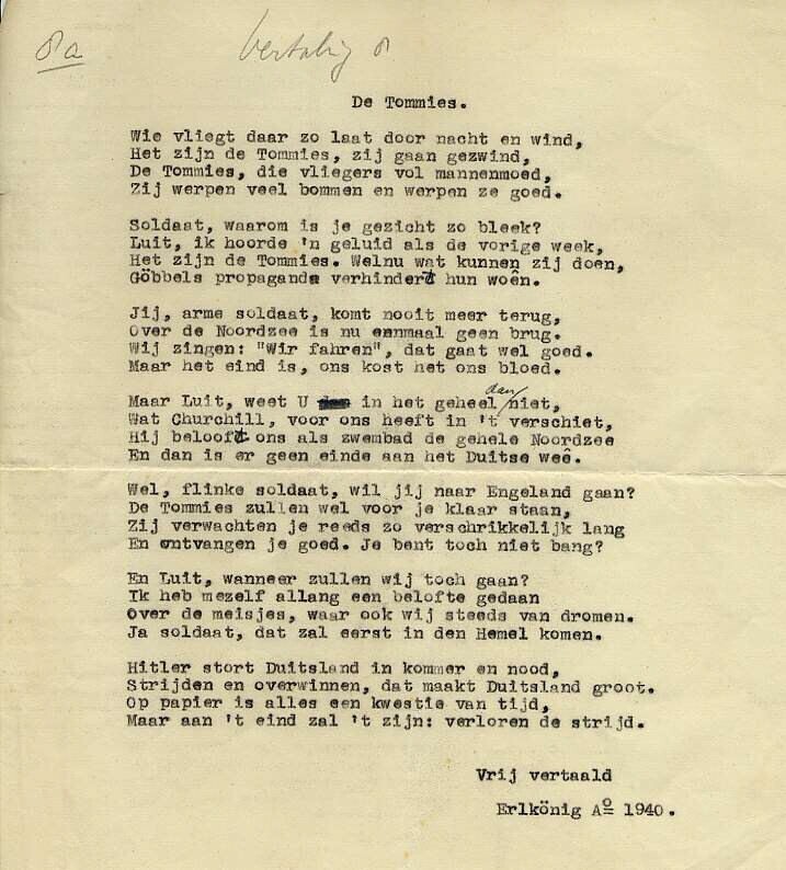 Satirisch gedicht van zeven coupletten over Engelse vliegeniers. Onderaan is vermeld: 'Vrij vertaald Erlkönig anno 1940'.