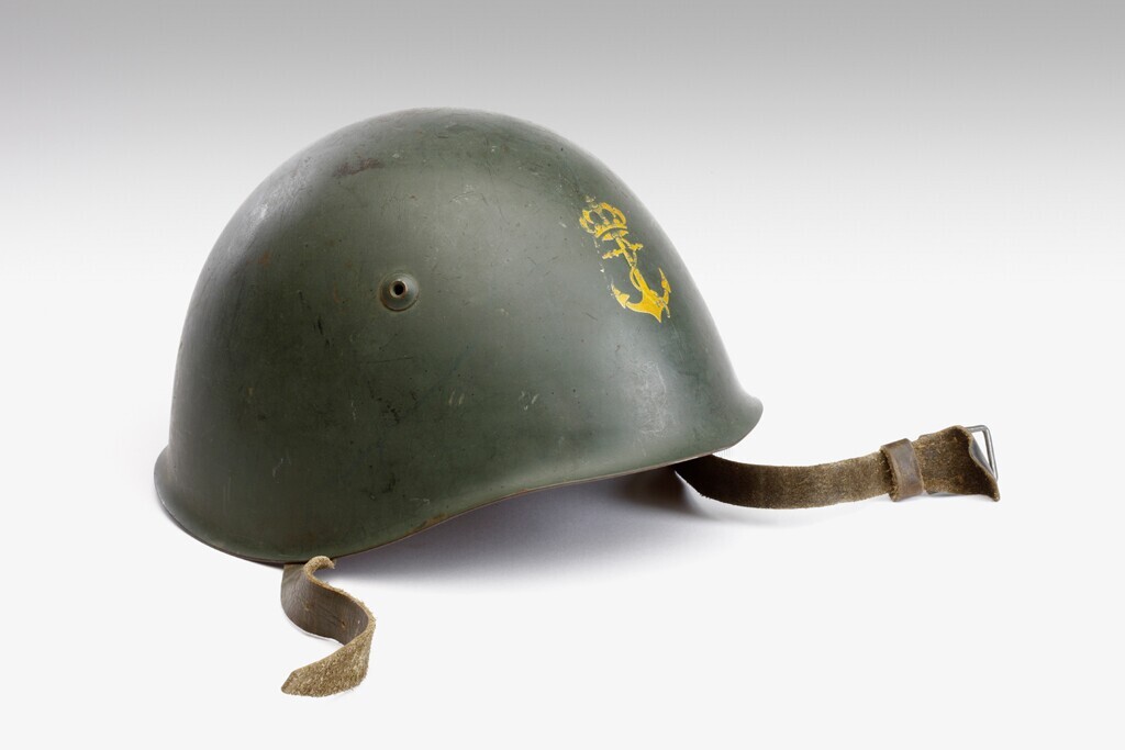 Een groene Italiaanse mariniershelm, type M1933. Op de voorkant een afbeelding in geel van een bekroond anker. Compleet met binnenwerk en kinband van leer.