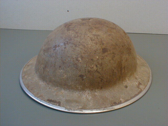 Engelse legerhelm met binnenwerk bestaand uit een hoofdband van kunstleer en een kinband van stof.
