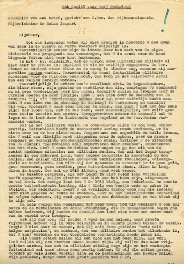 Afschrift van een brief aan Dr. Seyss-Inquart van het Comité voor Vrij Nederland . In de brief worden aan de achterzijde een vijftal eisen opgesomd. Ondertekend met: Het Comité. Rechts bovenaan een groen uitroepteken waarschijnlijk van later datum.