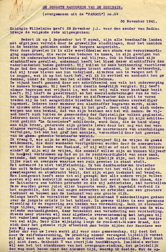In blauwe inkt gestencilde tekst van de radiorede van de Koningin, overgenomen uit het "Parool" nummer 29. De tekst omvat 12 pagina's.