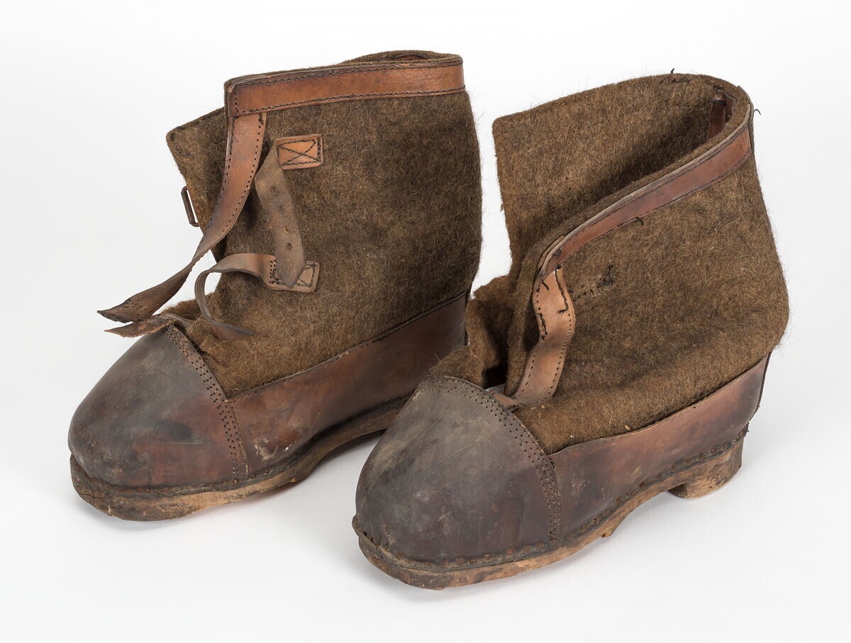Een paar Duitse overschoenen om bij zeer lage temperatuur op wacht te staan. De schoenen zijn van leer en vilt met houten zolen.