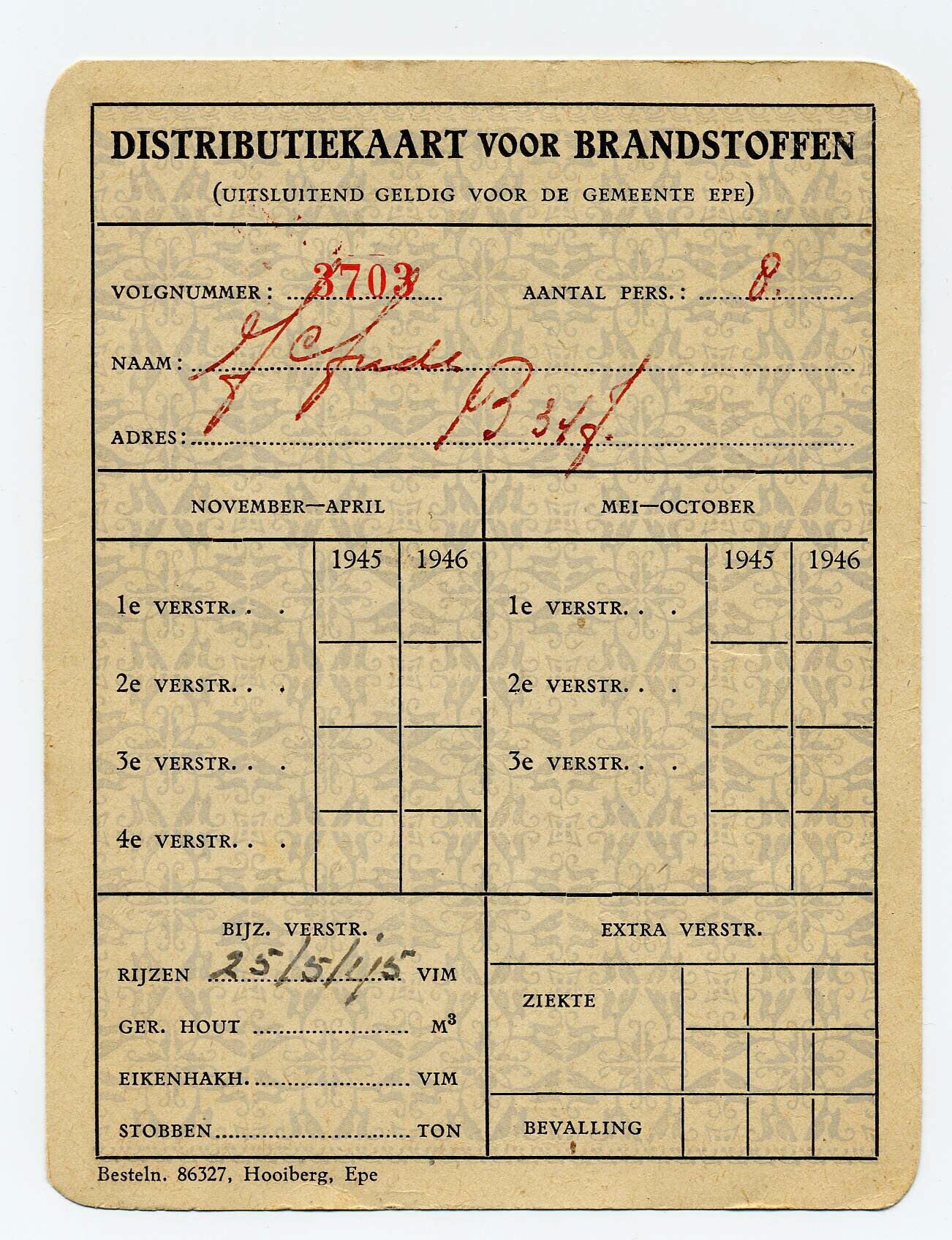 Een 'Distributiekaart voor brandstoffen (uitsluitend geldig voor de gemeente Epe)' uitgegeven van het Distributiekantoor. Op de achterzijde staan bijzondere bepalingen vermeld.