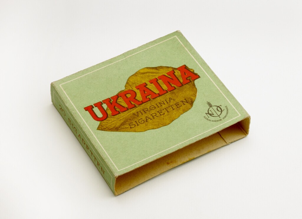 Een groene omslag van een sigarettenpakje. Aan de voorkant de afbeelding van een tabaksblad, daaroverheen in rode letters de merknaam' Ukraina' en: 'Virginia sigaretten'. Rechtsonder het logo van de nationaalsocialistische Nederlandsche Oostcompagnie. Aan de achterkant centraal opnieuw het logo van NOC en de informatie dat deze sigaretten door hen verdeeld zijn "aan al diegenen uit Nederland die zich in/of voor de bezette oostgebieden hebben ingezet".