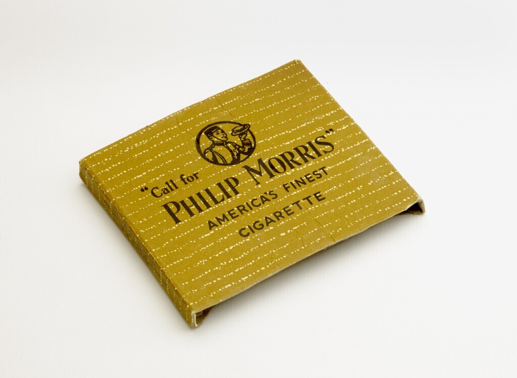 Een bruine omslag van een sigarettenpakje. Horizontaal over het pakje lopen beige stippellijnen. Op de voor- en achterkant: "'Call for Philip Morris' America's finest cigarette". Hierboven in een rond kader de afbeelding van een geüniformeerde bediende die een pakje aandraagt op een presenteerblaadje.