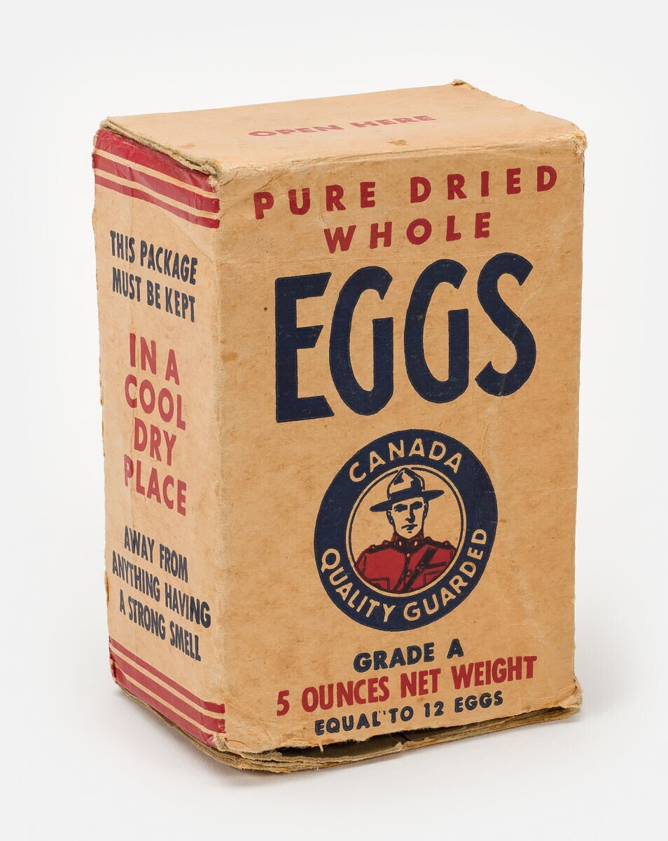 Een verpakking voor eierpoeder. Op de voorkant van het witte kartonnen doosje: "Pure dry whole" in rood en in blauw: "Eggs". Hieronder in een medaillon met blauwe rand het portret van een 'Mounty'': Canadese bereden politie. In de blauwe rand van het medaillon: "Canada Quality Guarded". Op de zijkanten o.a.: "12 eggs" en: "In a cool dry place". Aan de achterkant de gebruiksaanwijzing.