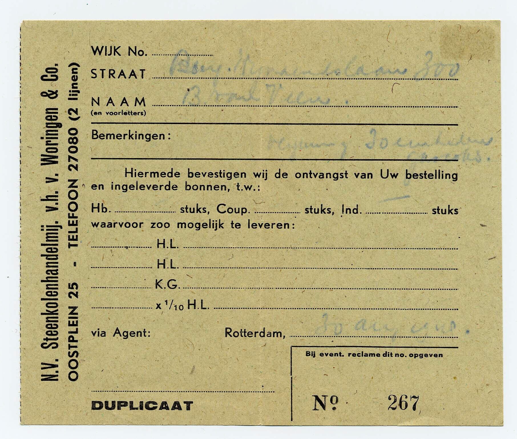 Drie duplicaat ontvangstbewijzen van bestelling en ingeleverde bonnen van NV. Steenkolenhandelmij v.h. v. Woringen & Co, te Rotterdam. De drie doorslagen no. 2689, 1780 en 267 zijn gedeeltelijk ingevuld. No.267 op naam van B. van Veen, bemerkingen: 30 eenheden cooks, 30 augustus 1948 en No. 1780 op naam van B. van Veen, bemerkingen: 3-4, 20 september 1948 en No. 2689 op naam van B. van Veen, bemerkingen: 6, 8 juni 1949.<br>