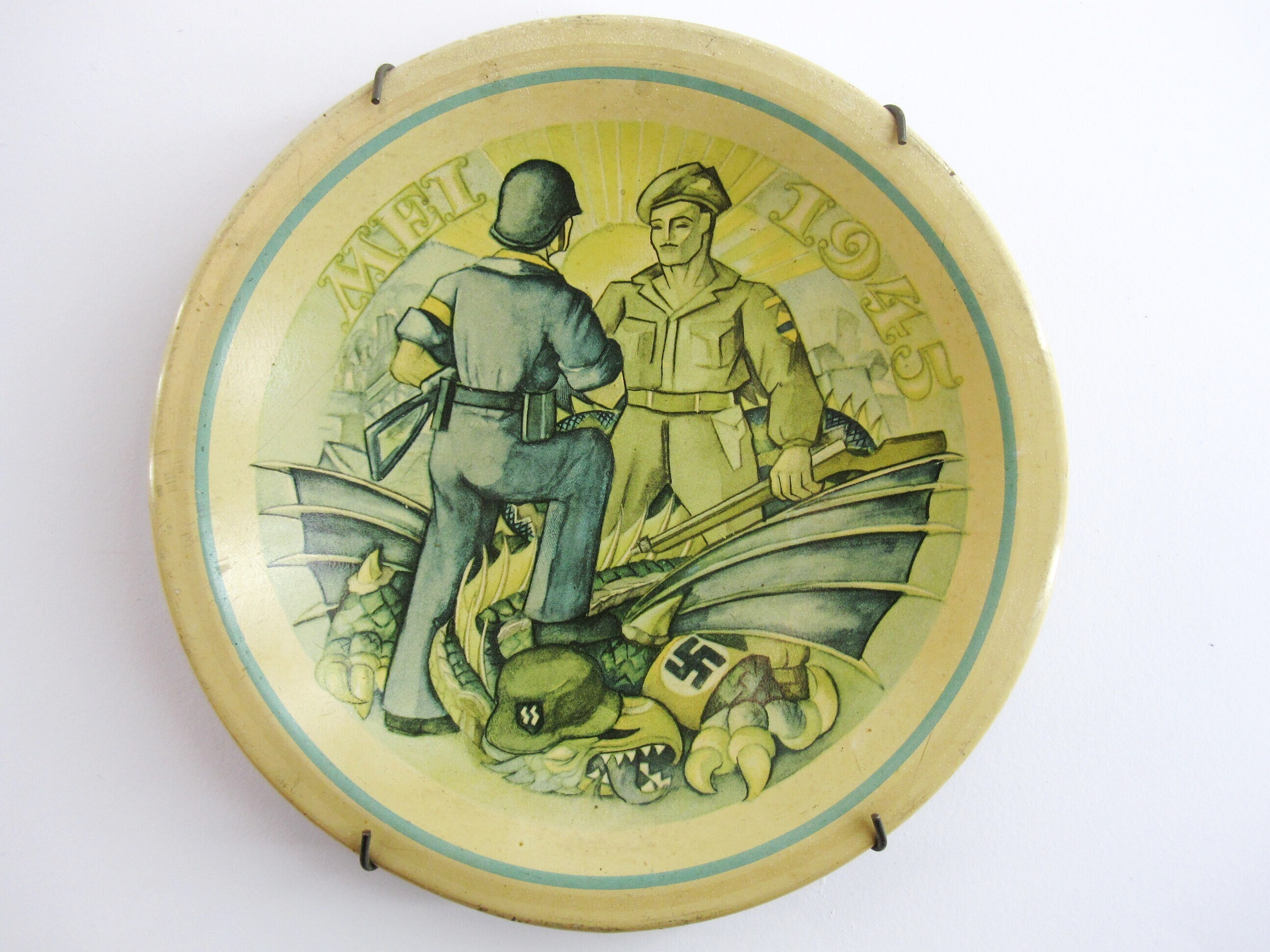 Een metalen gedenkbord met in het midden de afbeelding van een Canadese militair die, hoewel dit niet goed zichtbaar is, de hand schudt van een BS-er met helm en wapen. De laatste staat op een op de grond liggend overwonnen gevleugeld monster met de symbolen van het Derde Rijk. Bij de afbeelding staat het jaartal: "Mei 1945". Op de onderkant staat geen tekst of merkteken. Het bordje is gevat in een metalen houder met metalen veren. Aan de houder kan het bordje aan een wand worden opgehangen.