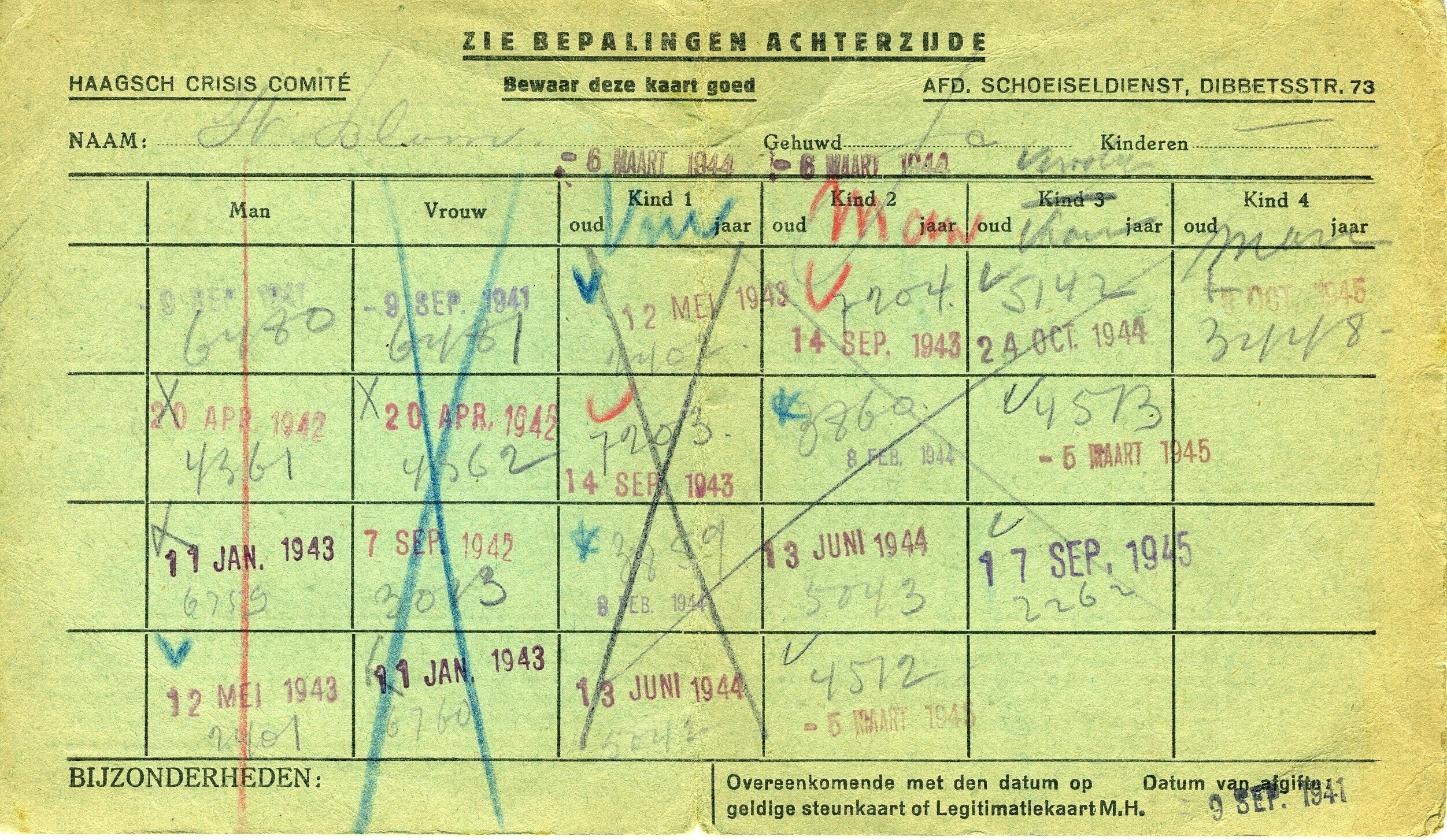 Een gebruikte groene kaart van het Haagsch Crisis Comité van de afdeling Schoeiseldienst, Dibbetsstraat 73. De schoenenmakers(reparatie)kaart heeft aan de voor- en achterkant diverse gekleurde datumtempels en aantekeningen.<br>