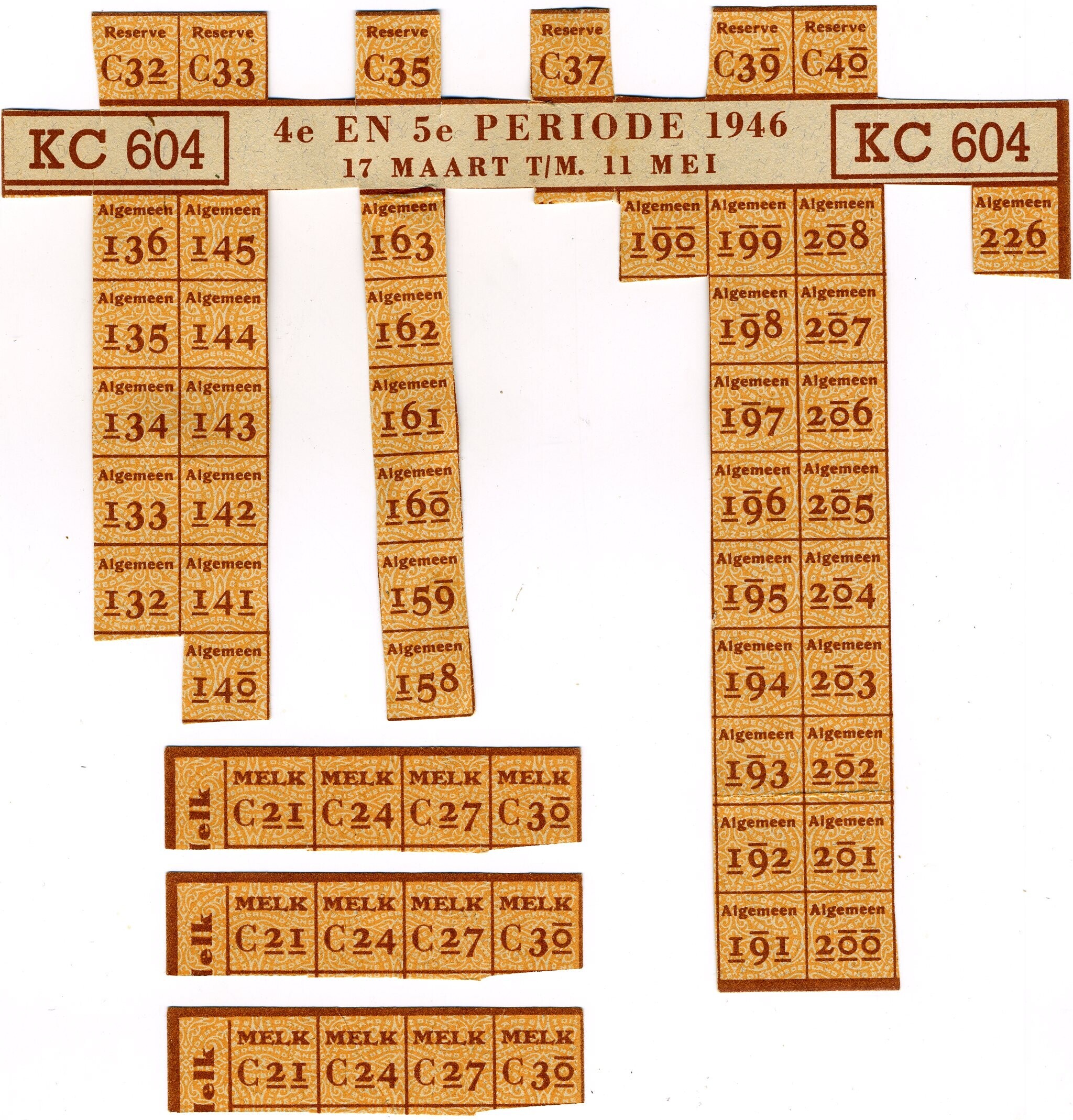 Een gebruikte Bonkaart KC 604 met nog enkele bonnen Algemeen en Reserve, geldig van 17 maart tot en met 11 mei 1946 (vierde en vijfde periode). Drie losse stroken met melkbonnen.