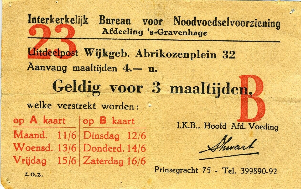 Een lichtbruine kaart van het Interkerkelijke Bureau voor Noodvoedselvoorziening. De kaart is geldig voor drie maaltijden. Op de achterkant de algemene bepalingen.