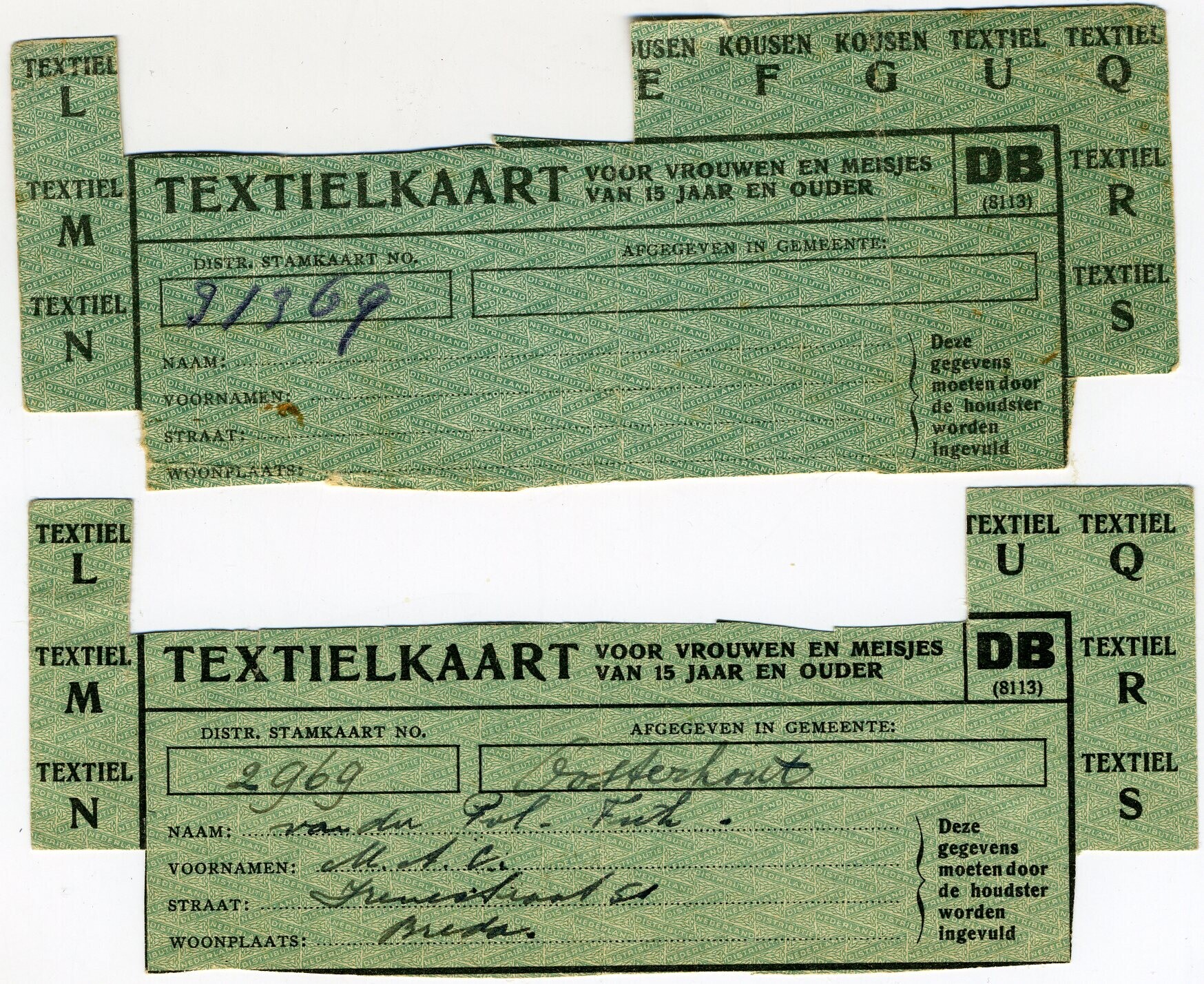 Twee gebruikte groene Textielkaarten voor vrouwen en meisjes van 15 jaar en ouder met enkele textielbonnen. Op de achterkant stempels van de distributiekringen Breda en Utrecht.