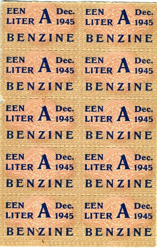 Twee bonkaarten voor het verkrijgen van een liter benzine. Het betreft de perioden december 1945 en april 1946.
