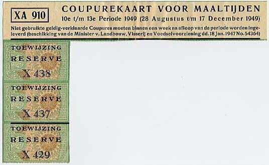 Twee groenbruine coupurekaarten voor maaltijden voor de tiende tot en met de dertiende periode 1949. De kaarten hebben nog drie bonnen met het opschrift Toewijzing reserve.<br>