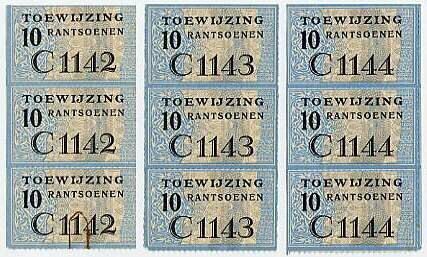 Drie stroken met drie bonnen met zwarte, lichtblauwe en grijze opdruk: ''Toewijzing 10 Rantsoenen'' met nummers C1142 tot en met C1144.<br>