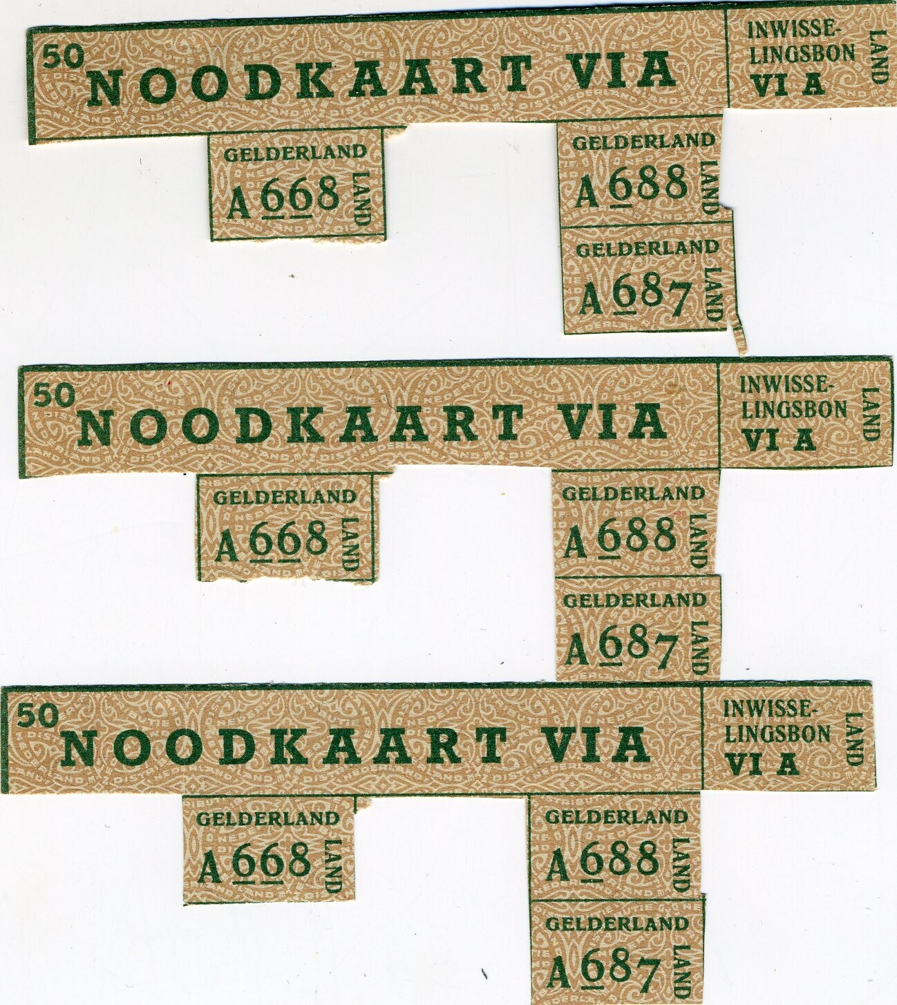 Drie gebruikte exemplaren van Noodkaart VI A - Gelderland - met nog drie stroken losse genummerde bonnen.