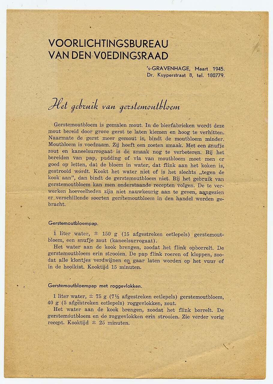 Uitgave van het Voorlichtingsbureau van den Voedingsraad met recepten over het gebruik van gerstemoutbloem.