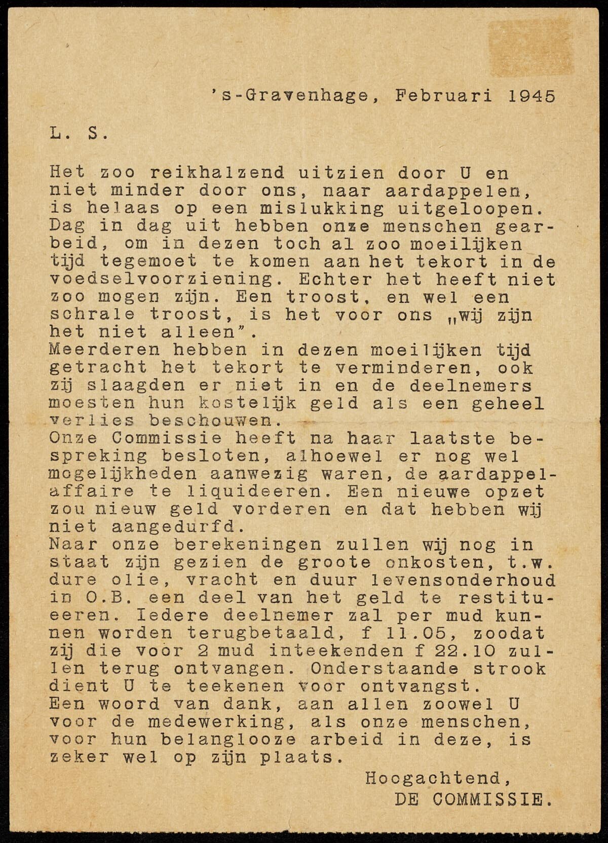 Gestencilde brief, gedateerd: 's-Gravenhage, februari 1945, waarin wordt ingegaan op het mislukken van de inkoop van aardappelen.