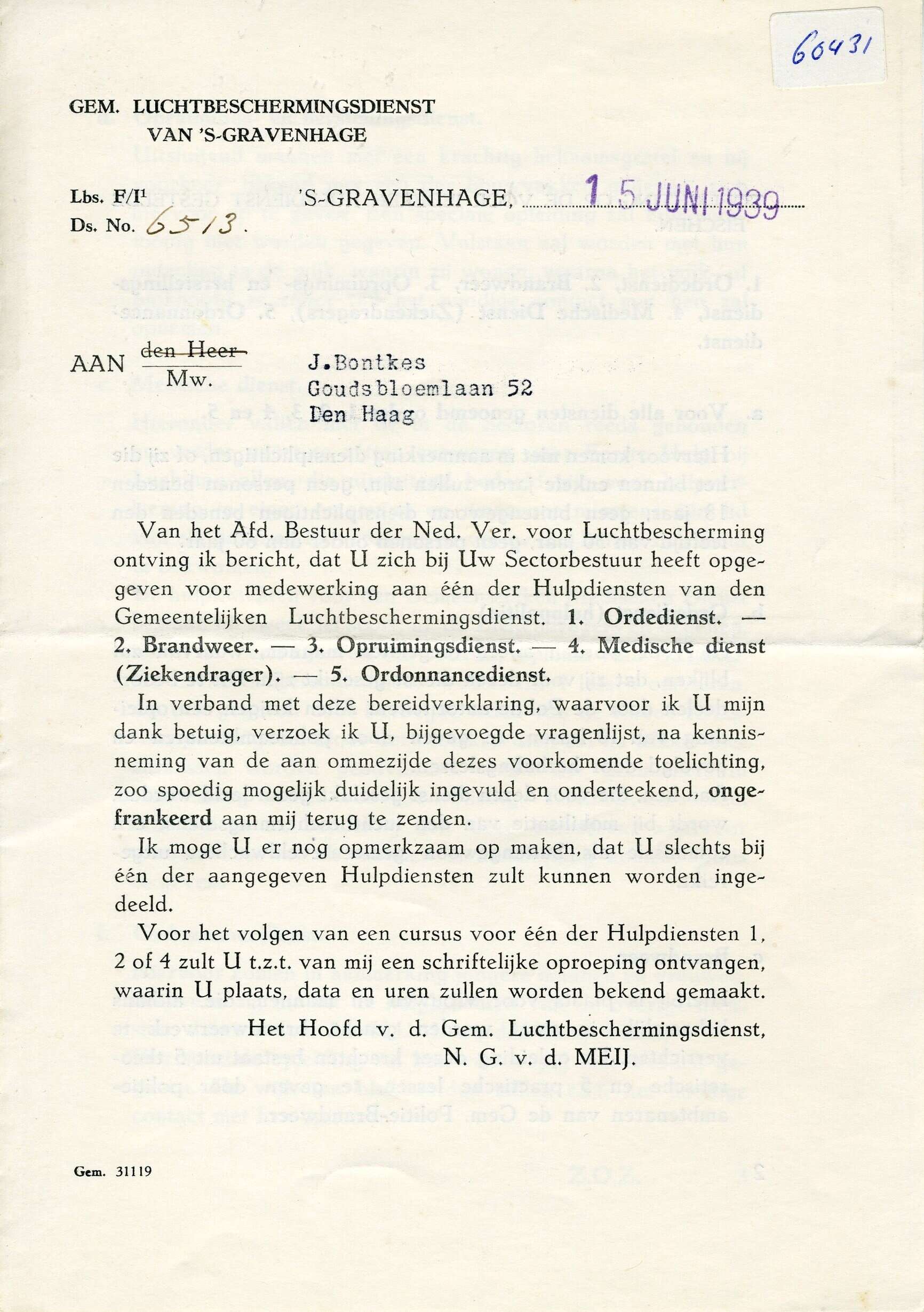 Standaard voorlichtingsblad, verstuurd aan Mw. J. Bontkes naar aanleiding van haar aanmelding bij een van de hulpdiensten van de Luchtbeschermingsdienst, met daarin een toelichting op de specifieke eisen voor deelname aan de verschillende diensten.