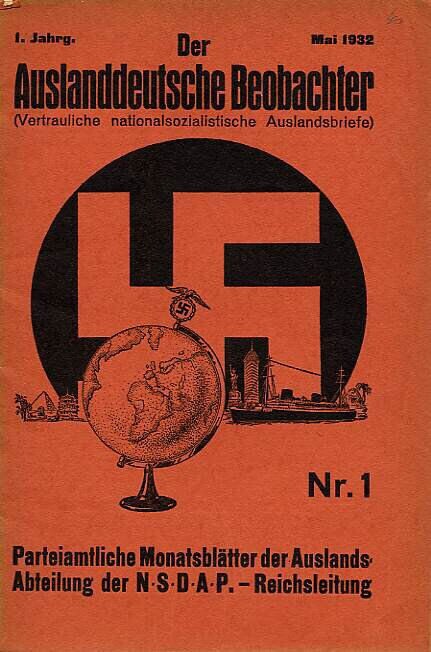 Maandelijks tijdschrift uitgegeven door de Buitenland afdeling van de N.S.D.A.P. Het betreft jaargang 1, nummer 1 (mei 1932). Met onder andere een verslag van een bijeenkomst van Nazi's in Amsterdam. Op de kaft een hakenkruis, een wereldbol en kenmerkende buitenlandse symbolen. Het tijdschrift omvat 30 pagina's.